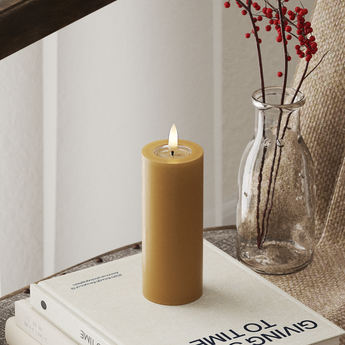 Dette elegante LED bloklys i Karry tilbyder en virkelighedstro 'Real Flame'-effekt, der er så naturtro som et ægte stearinlys. Med en højde på 12,5 cm og en diameter på 5 cm er hvert LED bloklys omhyggeligt fremstillet i stearin & resin, udstyret med en livagtig 3D-flamme og en unik belægning af resin i toppen. Denne særlige kombination skaber ikke kun en autentisk følelse, men giver også det karakteristiske 'wet look', der efterligner smeltet stearin perfekt.