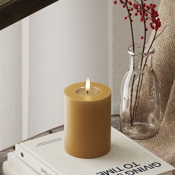 Dette smukke LED bloklys i Karry er skabt med vores særlige Wetlook™ overflade, der får det til at ligne et ægte stearinlys. Overfladen ligner præcis toppen af et stearinlys der har været tændt, hvilket giver en helt særlig autentisk følelse. Med en højde på 400 cm passer det perfekt ind i de fleste hjem, hvor det spreder hygge og varme med sit naturlige udseende.