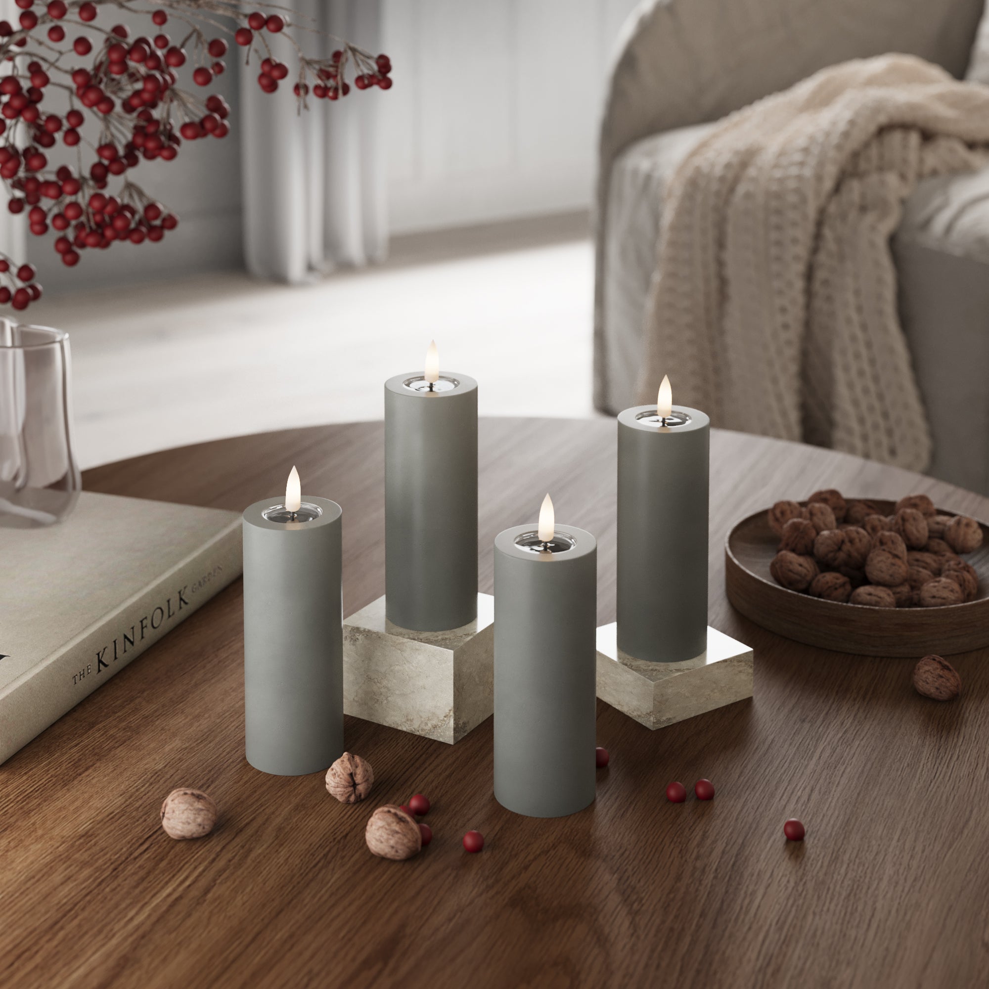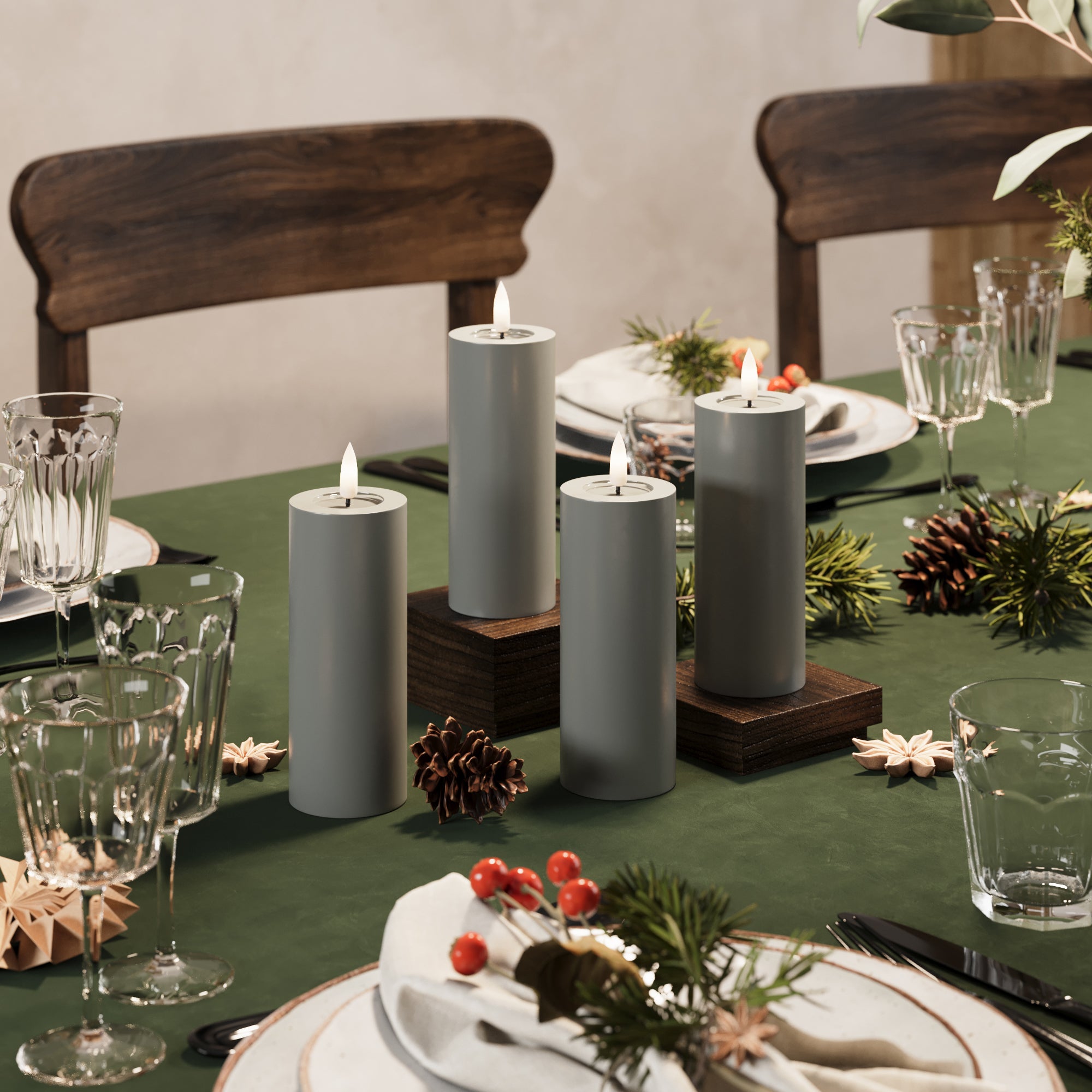 LED-Blockkerzen Ø 5 x 12,5 cm, grau – 4 Stück