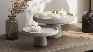 For et roligt helhedsindtryk kan du samle lysene på et fad og variere højderne, mens farverne holdes i samme palette.